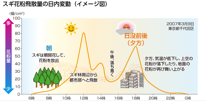 毎日の天気を確認するのと同じように花粉情報もチェックし、なるべく花粉飛散量の多い時間帯の外出を控えるようにしましょう。