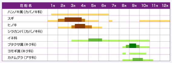 スギは、3月中旬から5月中旬にかけて飛散量が多く、ヒノキは、4月下旬から6月にかけてピークを迎えると言われています。その他にも、1年通して季節を問わず花粉が飛散しているため、秋にもイネ科の植物やブタクサなどによる花粉症が起こることもあります。代表的な植物の花粉飛散時期は下記の表のとおりです。